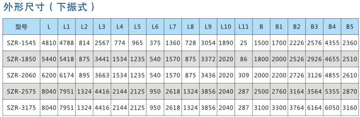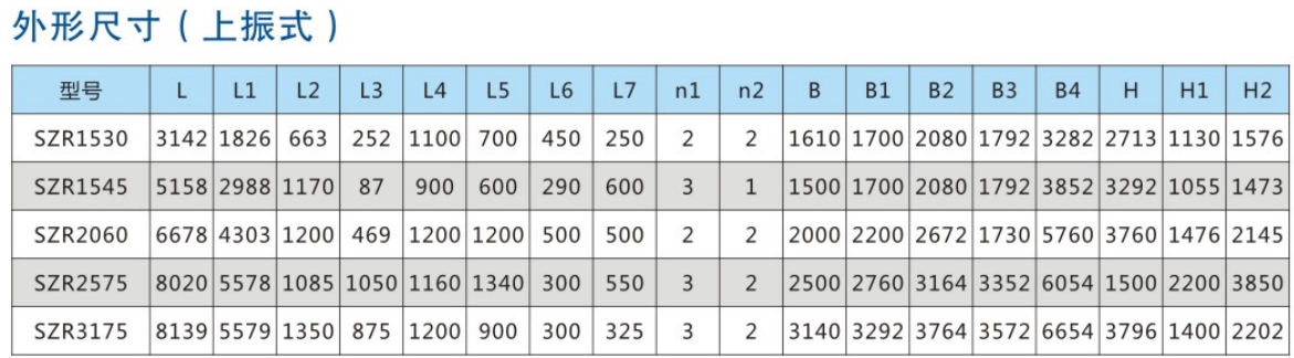 SZR係(xì)列熱礦振動篩均為座式安裝。采用雙軸激振器,電機(jī)不參振;由(yóu)兩台電機外拖動激振(zhèn)器作反向自同步旋轉,使篩體沿(yán)直(zhí)線方向作周(zhōu)期性往(wǎng)複運動,從而達到篩分目的。
